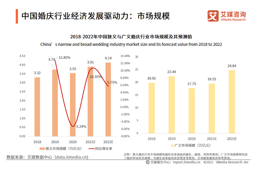 然而,在疫情“黑天鵝”的影響下,國內(nèi)婚慶市場因其與線下多產(chǎn)業(yè)鏈條強關(guān)聯(lián)特性暫時遇冷,婚慶行業(yè)市場規(guī)模有小幅度下跌,但隨著疫情常態(tài)化防控,婚慶市場逐漸回暖,消費需求日趨增長,投資前景向好。