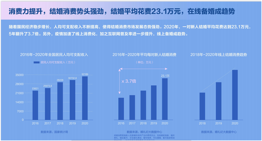 同時,疫情背景下數(shù)字技術(shù)和應(yīng)用的不斷普及和優(yōu)化,也給婚慶行業(yè)帶來了新的模式轉(zhuǎn)型契機,以互聯(lián)網(wǎng)婚慶為代表的線上婚禮形態(tài)多元,數(shù)字化婚禮趨勢日益清晰。