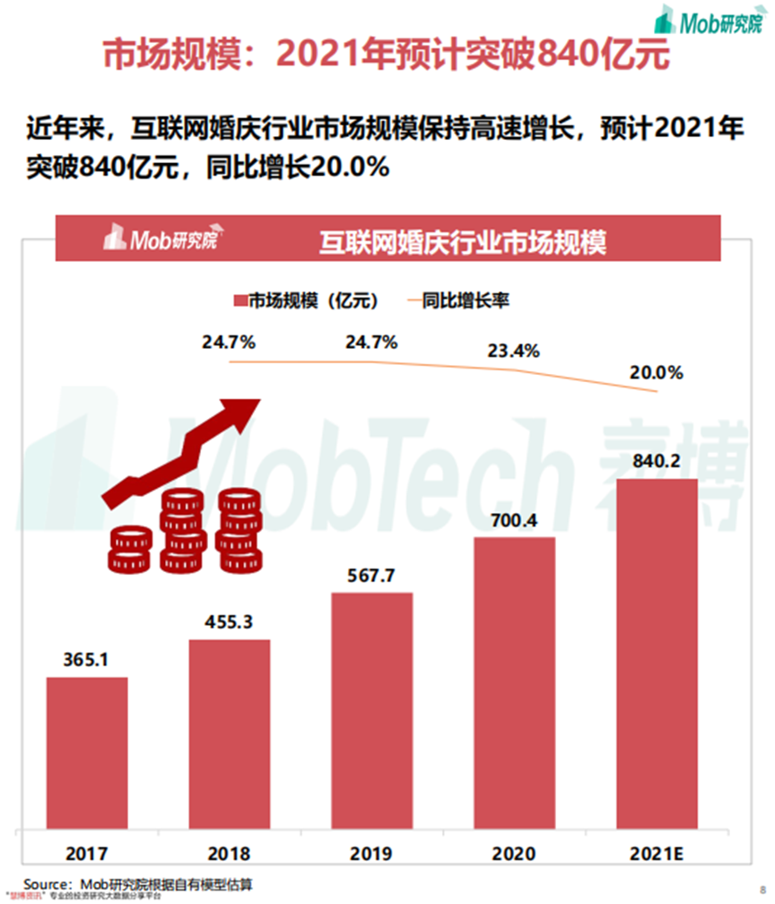 據(jù)艾媒咨詢報告分析,目前中國20-40歲的適婚人口總量約為4.47億人,大量的適婚人口,為中國婚慶市場增加了潛在客戶。而隨著居民收入的增加和生活品質(zhì)的提高,婚慶質(zhì)量要求逐年上升,形式趨于多樣化,形成了巨大的增量市場。