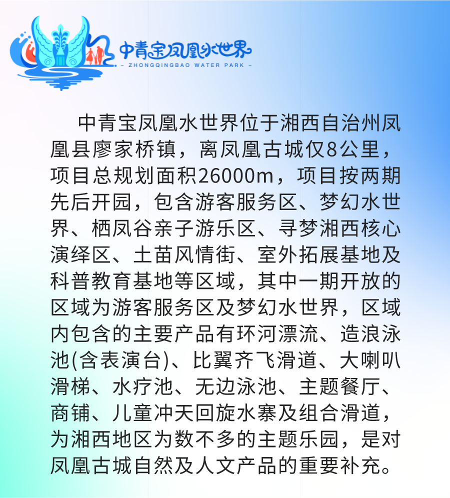 由深圳中青寶互動(dòng)網(wǎng)絡(luò)股份有限公司(以下簡(jiǎn)稱:中青寶)以“湘西印象”為魂,以湘西文化故事為背景,將現(xiàn)代娛樂理念與湘西民俗文化相結(jié)合,以沉浸式民俗演繹、主題化場(chǎng)景、水上游樂項(xiàng)目為媒介,傳承發(fā)展湘西民俗文化,致力于打造極具現(xiàn)代思潮的湘西文化水公園,試運(yùn)營籌備工作已啟動(dòng)!目前已在高速下道口、鳳凰古城高鐵站轉(zhuǎn)換大廳、古城專線大巴候車點(diǎn)、城北游客集散中心等地完成大型戶外廣告牌及燈箱廣告的刊登,并逐步推進(jìn)縣域公交站臺(tái)、戶外LED及廣告牌的宣傳。